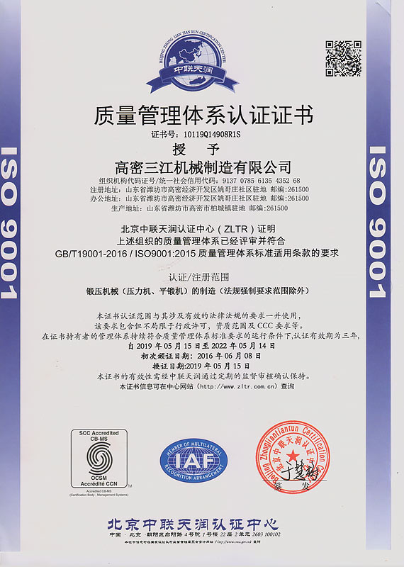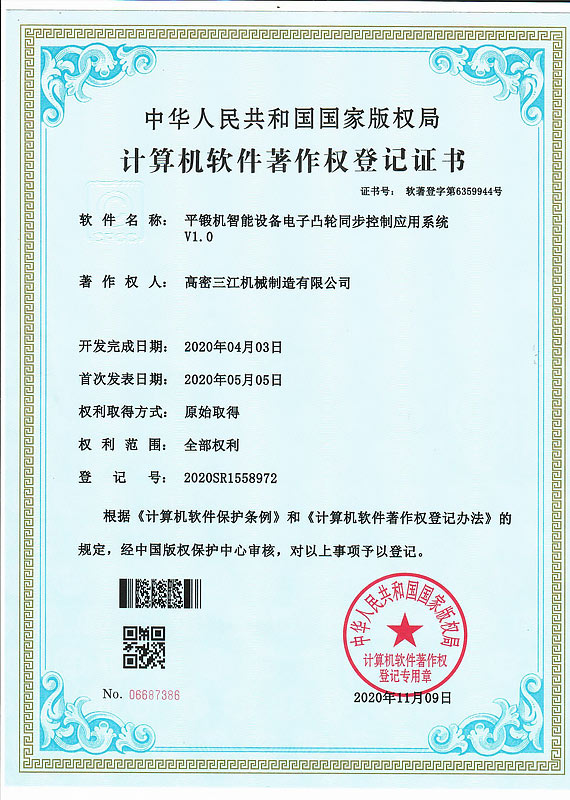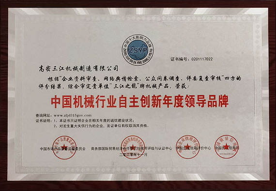 三江機器“以立異求成長”,重視常識產權請求和掩護,最近幾年來已獲得國度高新手藝企業和山東省“專精特新”企業,具有ISO9001品質辦理體系認證和歐盟CE認證。公司重視研發立異,共引進國際進步前輩手藝功效3項,獲得發現專利5項,適用新型專利30余項,軟件著述權5項。前后與南京航空航天大學、山東理工大學、青島科技大學等高校在金屬成形工藝和新資料利用等范疇睜開協作。
